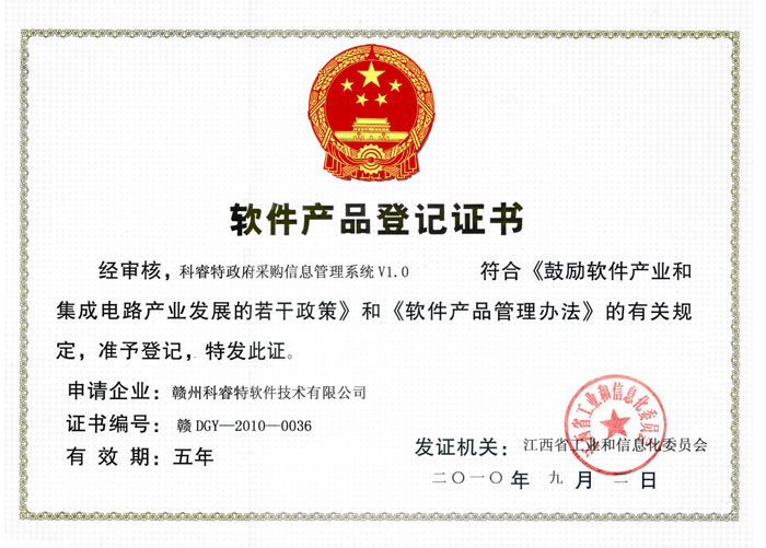 近日,江西省工业和信息化委员会发文,赣州科睿特软件技术有限公司(简称“赣州科睿特公司”)获得“软件企业”认证,其自主开发的电子政务软件《科睿特政府采购信息管理系统V1.0》取得“软件产品登记”。目前,赣州科睿特公司成为我市首家也是目前唯一通过“双软认证”的高科技企业。